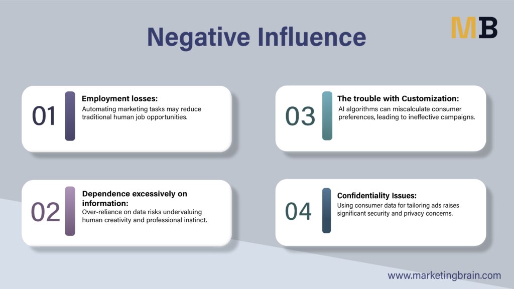 - Employment losses: As AI is utilized to streamline different aspects of marketing, it